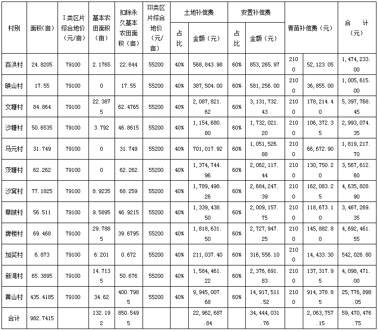 青苗补偿费、土地补偿费和安置补助费(含基本农田补偿费)共计59,470,476.75元,由临空经济区直接支付给被征地村组。