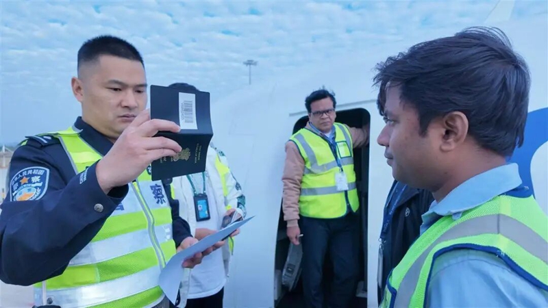 图为移民管理警察为机组办理出入境手续。(通讯员李磊摄)