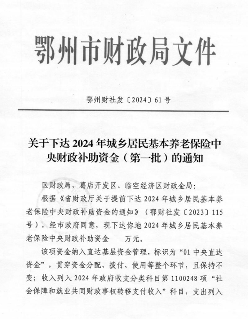关于下达2024年城乡居民基本养老保险中央财政补助资金(第一批)的通知