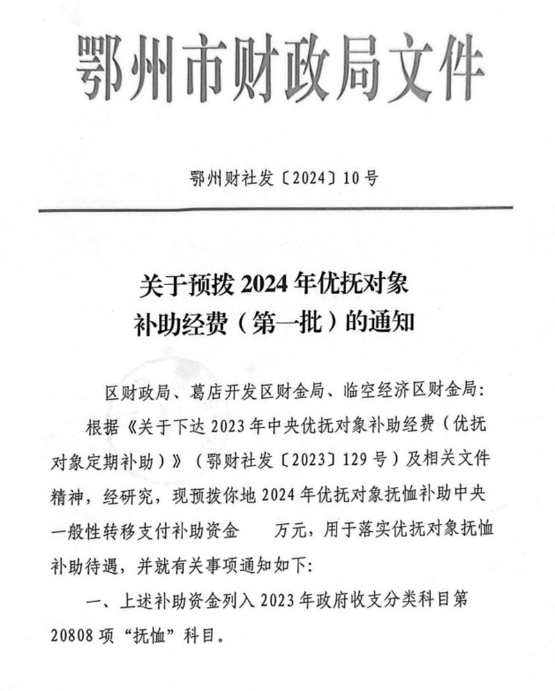关于预拨2024年优抚对象补助经费(第一批)的通知