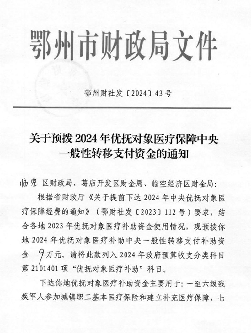 关于预拨2024年优抚对象医疗保障中央一般性转移支付资金的通知