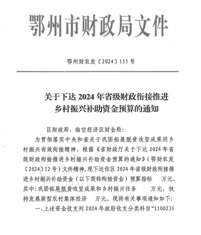 关于下达2024年省级财政衔接推进乡村振兴补助资金预算的通知