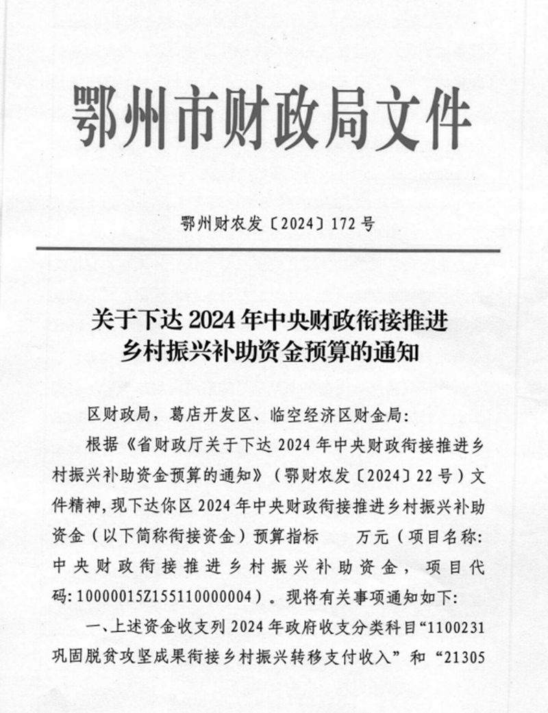 关于下达2024年中央财政衔接推进乡村振兴补助资金预算的通知