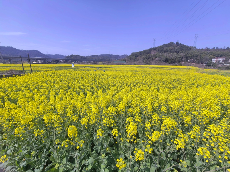 三月春风拂面,临空经济区的田野悄然换上“金装”。千亩油菜花竞相绽放,金黄的花朵如浪潮般铺展,与远山近水、白墙黛瓦交相辉映,勾勒出一幅诗意盎然的春日田园画卷。