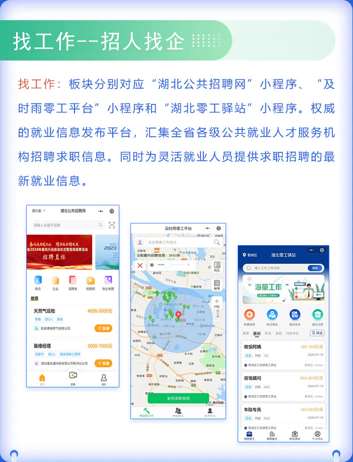 链接“湖北公共招聘网”“及时雨零工平台”“湖北零工驿站”小程序,及时掌握最新招聘求职信息,选择合适的岗位。