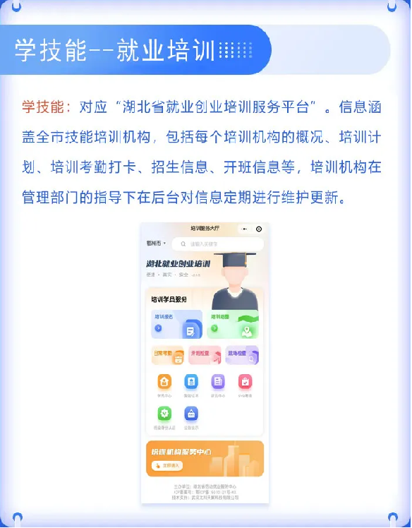 链接“湖北省就业创业培训服务平台”,及时掌握全市技能培训机构的概况、培训项目、招生信息、开班信息等。