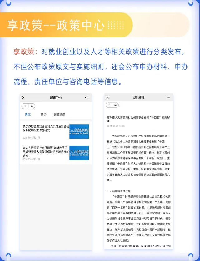 享政策链接鄂州市人社局官网,汇集各类就业创业政策及服务指南,及时查阅最新政策信息。