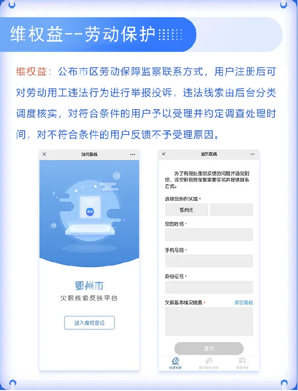维权益链接“治欠在线”平台,可以线上举报投诉劳动用工违法行为,维护自身合法权益。
