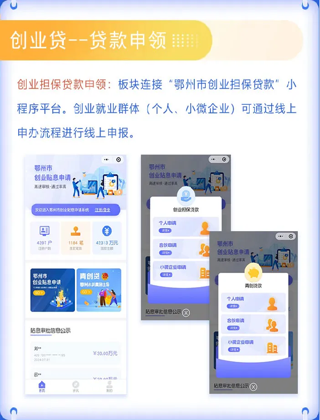 创业贷链接“鄂州市创业担保贷款”小程序,创业群体可直接进行线上申报。