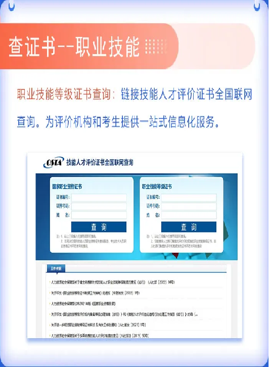 查证书链接“技能人才评价证书全国联网查询”平台,可随时随地查询职业资格证书、职业技能等级证书。