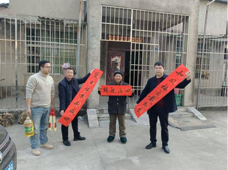 在鸭畈村,行动不便的艾大爷家门口,村干部将大红春联徐徐展开,老人欣喜地说:“这春联写的真好,想买也买不到啊,真好!”