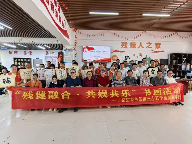 为迎接第35个 “全国助残日”,弘扬中华民族扶弱助残的传统美德与优秀传统文化,营造扶残助残的良好社会风尚,2025年5月19日,由临空经济区社会事务局主办,杨叶镇社会事务办承办、杨叶镇残疾人之家及杨叶镇社工站协办的 “残健融合,共娱共乐” 书画活动,在杨叶镇残疾人之家温情启幕。此次活动以书法艺术为桥梁,旨在丰富残疾群体的精神世界,促进残健融合,使其在社会的温暖关怀中,与健全人士共同品味艺术魅力,携手描绘幸福生活的绚丽篇章。