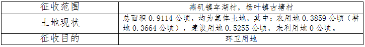 临空经济区管委会于2026年1月19日发布〔2026〕第002号《征收土地预公告》,拟征收临空区燕矶镇、杨叶镇集体土地0.9114公顷(13.671亩)。根据《中华人民共和国土地管理法》、《中华人民共和国土地管理法实施条例》的规定,现将拟征收土地补偿安置方案公告如下: