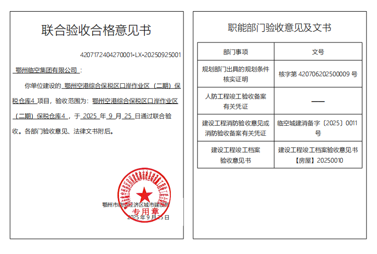 鄂州空港综合保税区口岸作业区(二期)保税仓库4 建设工程竣工档案验收意见书