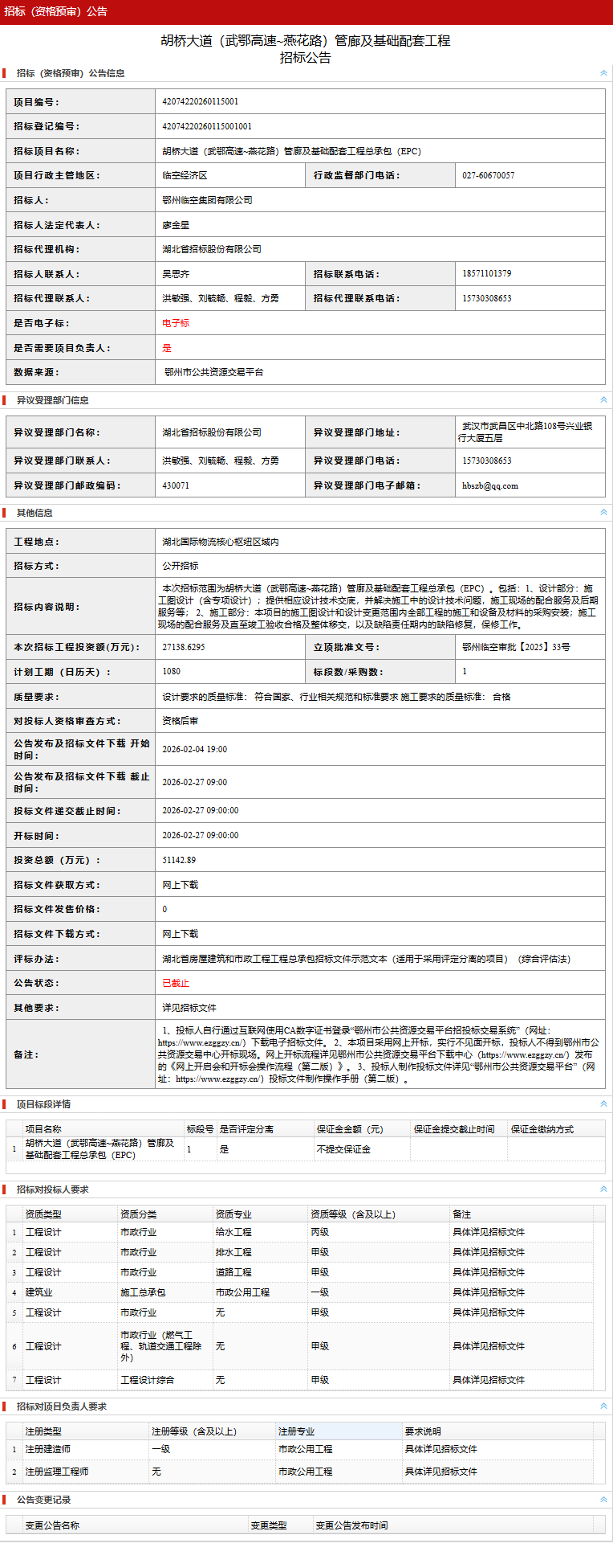 胡桥大道(武鄂高速~燕花路)管廊及基础配套工程招标公告