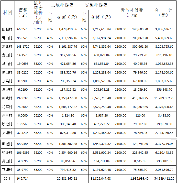 青苗补偿费、土地补偿费和安置补助费共计54,189,412.20元,由临空经济区直接支付给被征地村组。