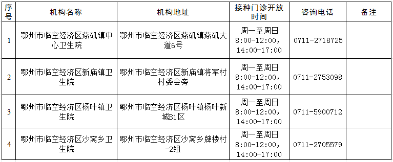湖北省鄂州市临空(市、区)提供流感疫苗接种服务的基层医疗卫生机构名单