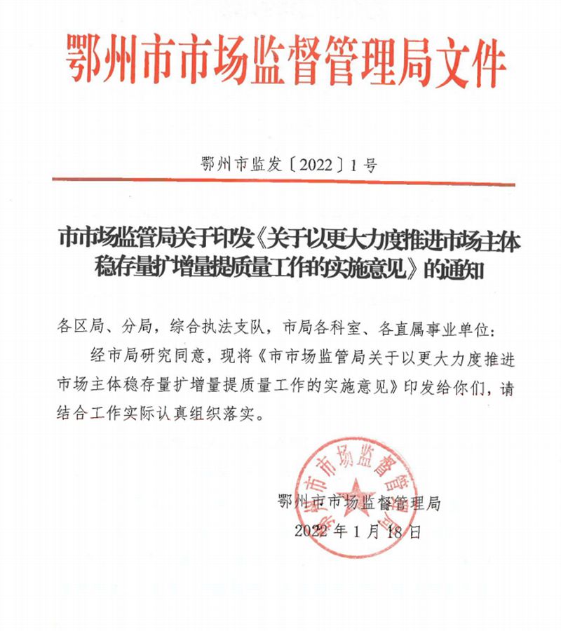附件1:鄂州市监发〔2022〕1号市市场监管局关于印发《关于以更大力度推进市场主体稳存量扩增量提质量工作的实施意见》的通知.pdf